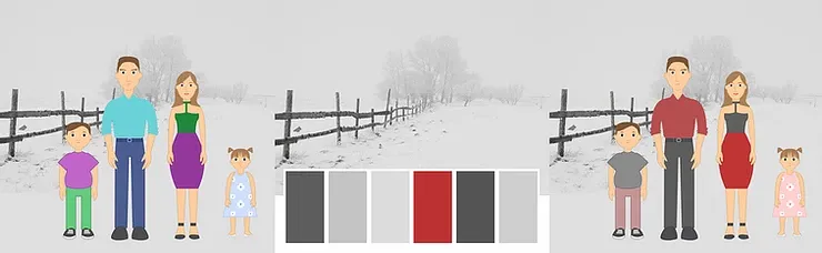 Wichtig ist, das man sich auf drei - nicht zu dunkle - Grundfarben einigt. Eine weitere etwas auffälligere, kräftigere Farbe ,die mehrere Familienmitglieder tragen, hebt alles etwas hervor.